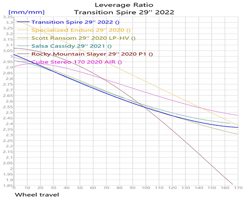 The leverage rate gives us an idea of how different areas of the travel will behave relative to one another. It determines the proportional stiffness of one area of the travel to another.A frame with a higher average leverage ratio will transmit more force to the shock for any given force at the wheel, therefore higher leverage ratio bikes require stiffer springs and/or higher air pressures to function properly. This need for more support can also limit your tuning options.