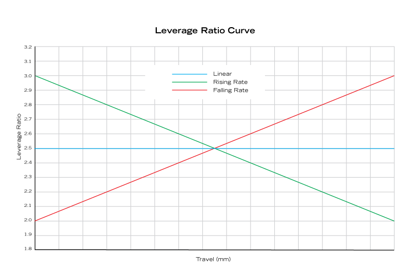 Linear Leverage Rate CurveA linear leverage rate curve is where the leverage ratio stays the same (or close to) throughout the entire rear wheel travel.Frames with linear leverage rate curves are better paired with shocks that have progressive qualities (air shocks) because the frame does not have progression built in. If you pair this type of frame with a linear coil shock, the frame’s suspension will not have any progression, meaning that you will likely bottom out often and lack end stroke support.Linear leverage rates give a more constant spring and damping rate throughout the travel, except for the variation in spring rates that the shock itself may give. If the shock is not progressive enough, it can be difficult to balance initial compliance (i.e. a soft enough beginning stroke) against bottoming resistance.'Falling Rate' Leverage Rate Curve
